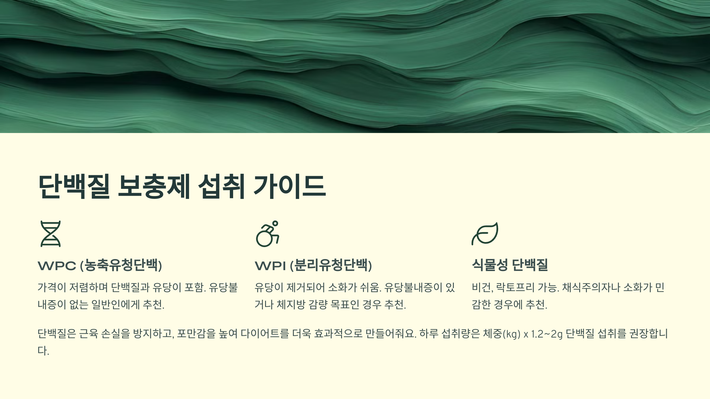 | 식물성 단백질 (콩, 완두 등) | 비건, 락토프리 가능 | 채식주의자, 소화가 민감한 경우 |