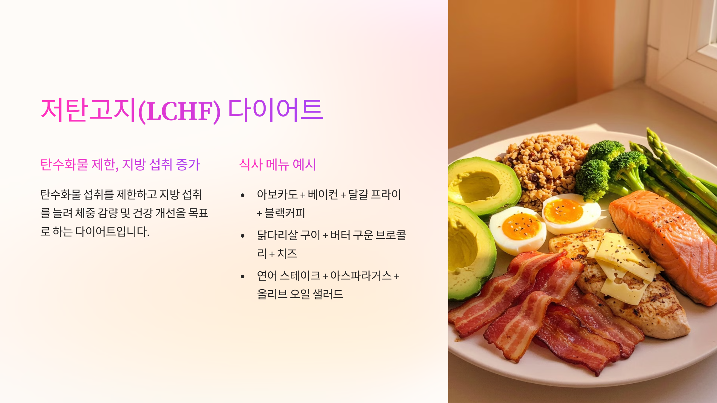 | 삶은 달걀 + 아보카도 토스트 | 단백질과 건강한 지방이 균형을 이룹니다. |